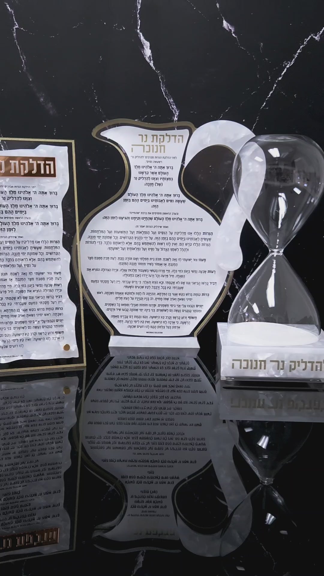 The base features “להדליק נר חנוכה” printed in metallic, beautifully displayed beneath a clear acrylic block wrapped in pearl marble for a refined and luxurious look.