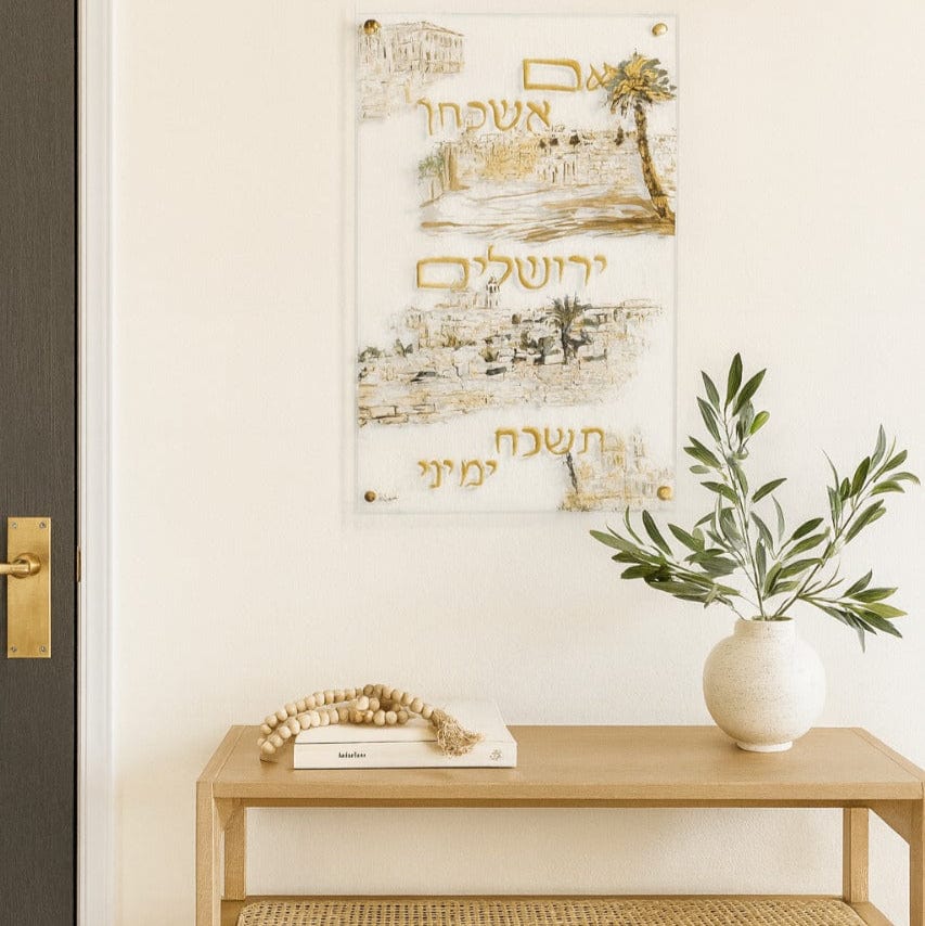 A heartfelt Jewish wall art piece featuring a printed design with a hand-painted look of the Kosel stones, paired with the timeless verse “אם אשכחך ירושלים תשכח ימיני” etched into the artwork. Printed on crystal-clear lucite, this elegant and meaningful Judaica decoration captures the beauty of Jerusalem and the depth of Jewish heritage. Though printed, the design offers rich texture and depth - resembling original brushstrokes.