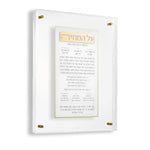 The Pearlstone Frame Al Hamichya (על המחיה) is a refined take on classic lucite Judaica. Featuring a soft pearl marble frame and a beautifully die-cut metallic heading, this elegant piece brings depth and clarity to the ברכה (bracha) we recite after eating grain-based foods. The blessing is printed on crystal-clear lucite with a white backing behind the text for easy reading and a clean, luminous finish.