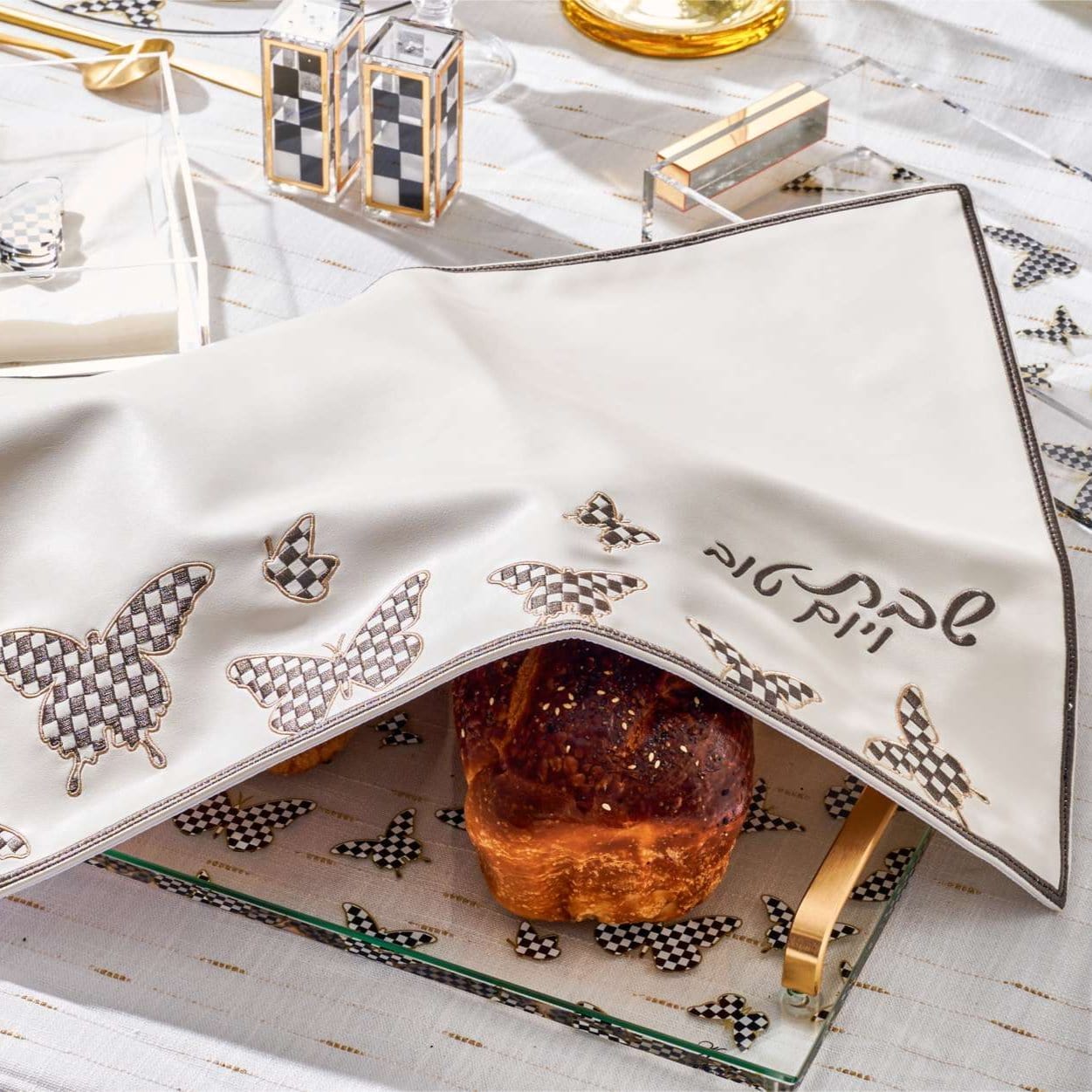 This magnificent Leather Challah Cover will make a striking addition to your Shabbos table. Unique design looks gorgeous when laid on top of Challahs. Features white leather with a onyx butterfly design. Premium quality & feel! Both practical and beautiful, this Challah cover would make a great gift.