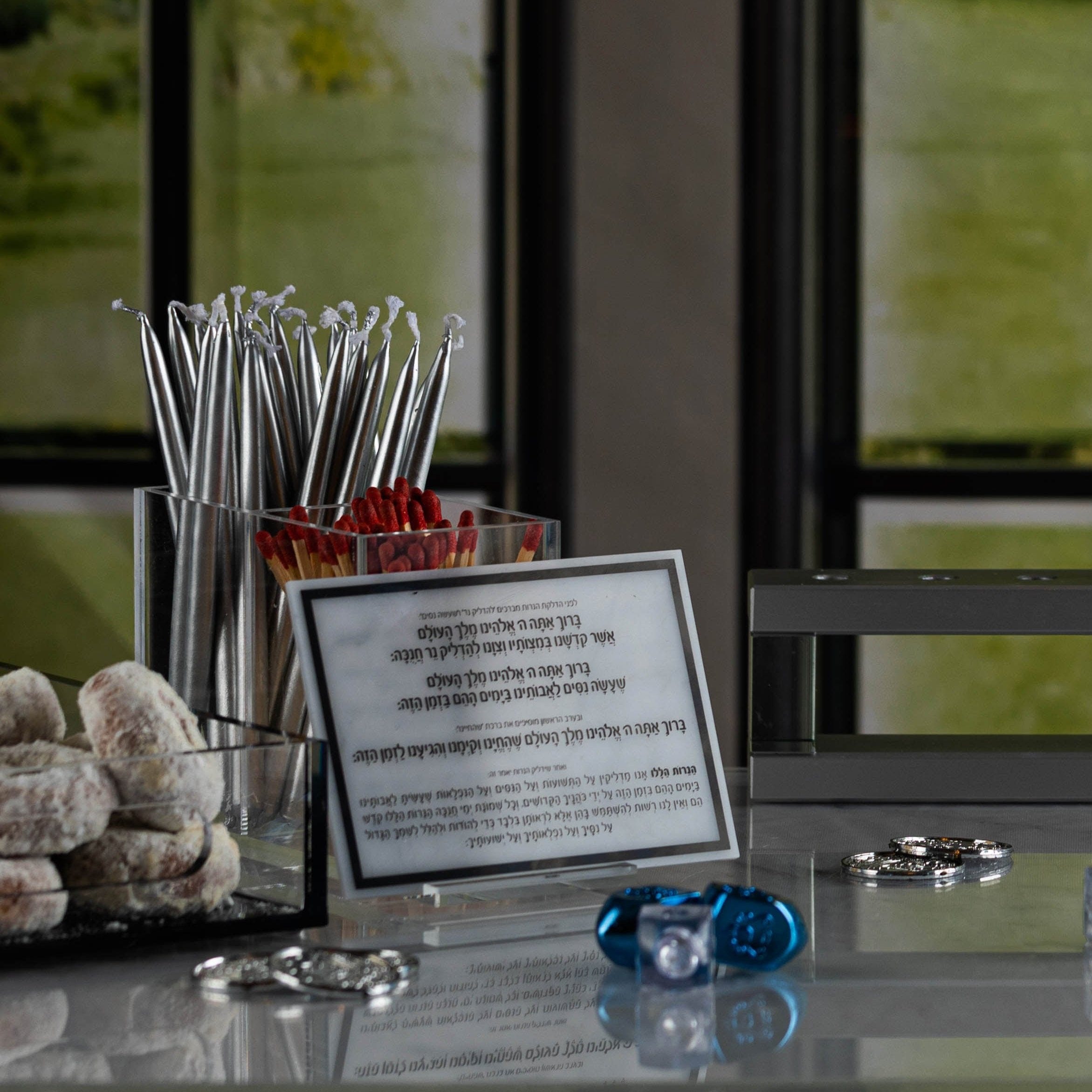 Store your candles, matches, and wicks in a neat beautiful display, and feature the Chanukah brachos. Fill the compartment, and lay the any lucite brachos card on the base in front. Neat & so useful!