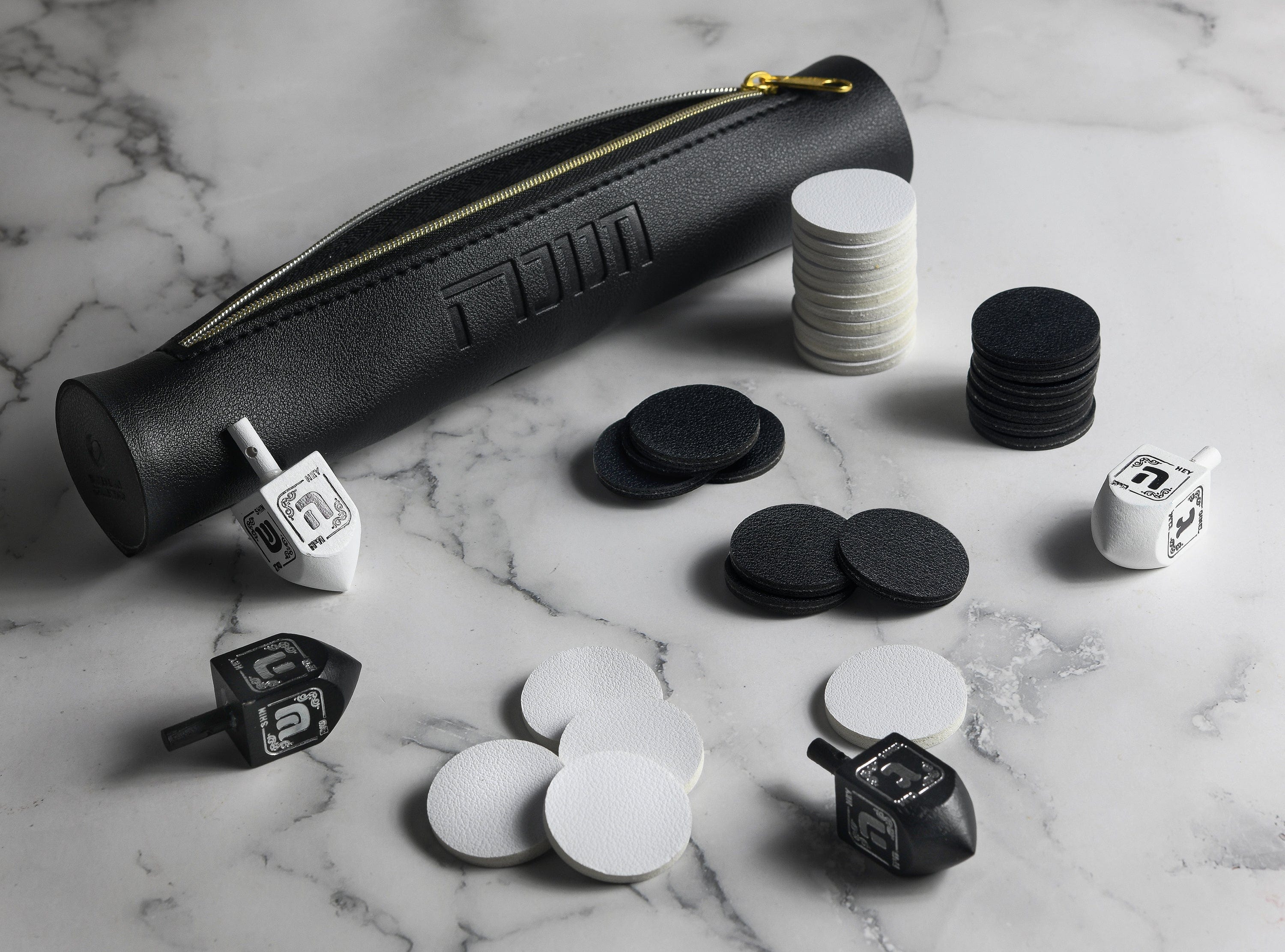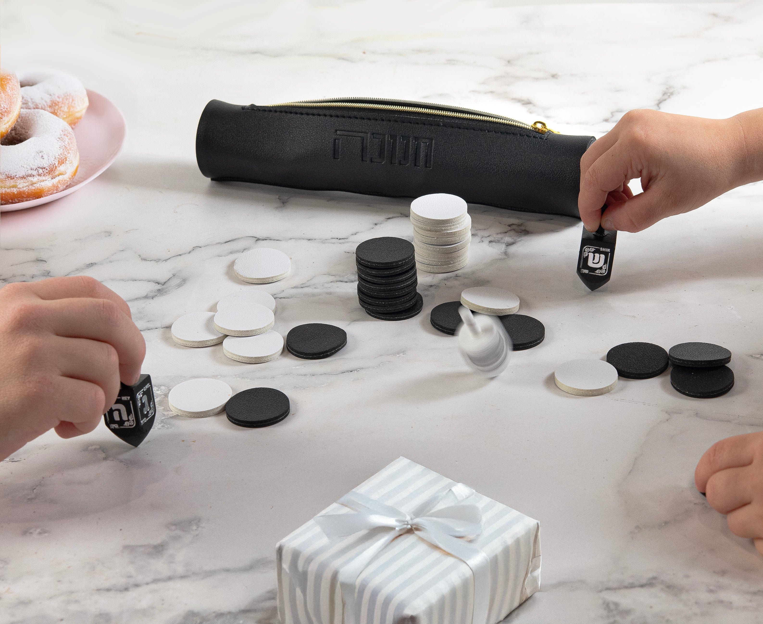 This stunning Leather Dreidel Game is a gorgeous timeless Judaica game. A modern take on our classic game. Includes a luxury leather case with embossed Chanukah details. 2 color leather coins and 8 dreidels.