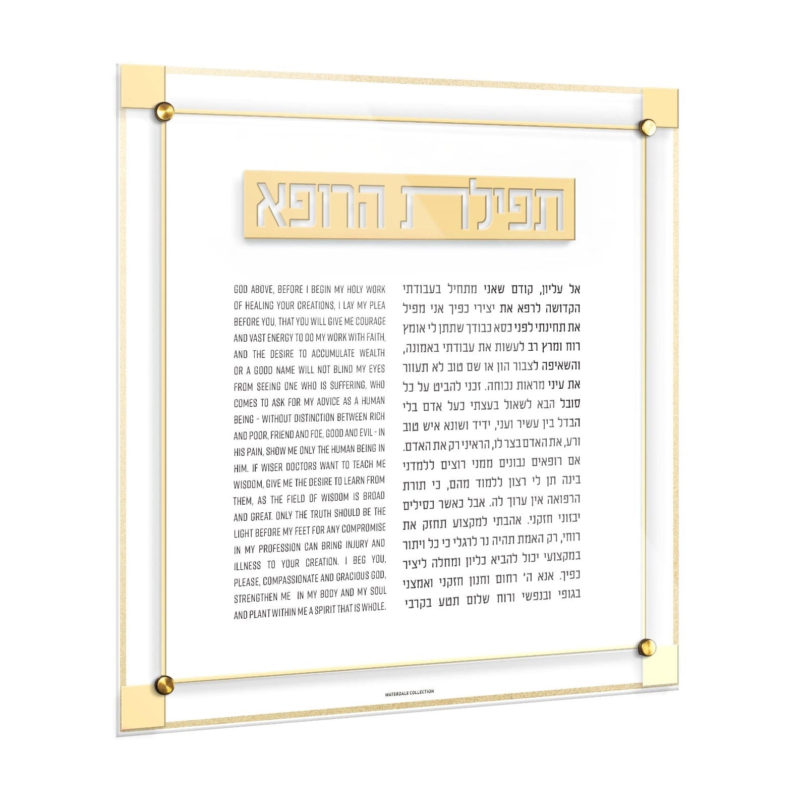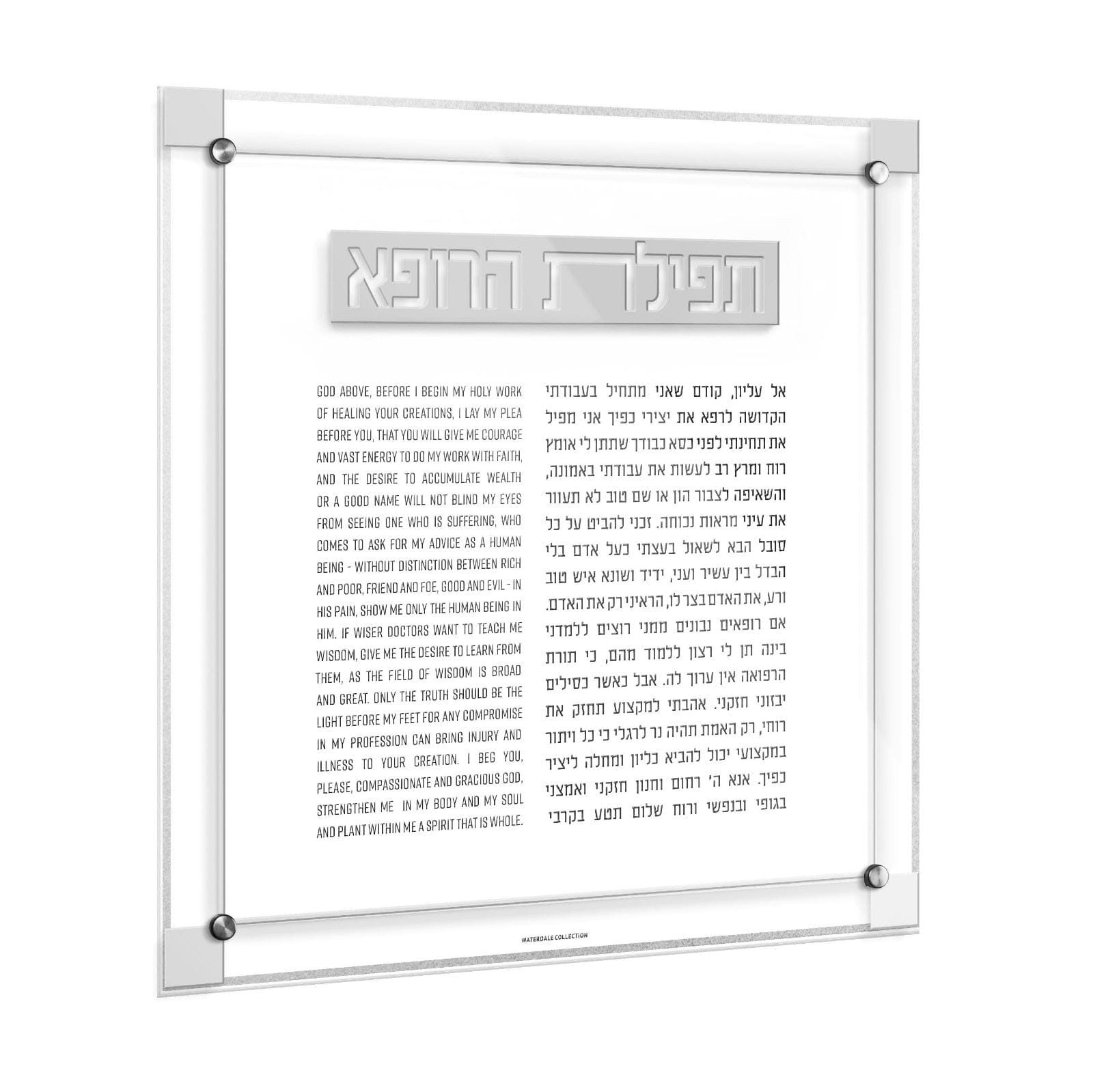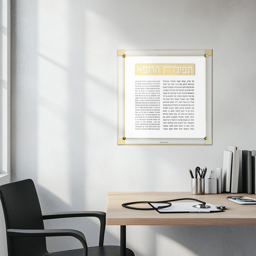 The Classic 2.0 Tefillas Harofeh/Doctor's Prayer brings a fresh twist to traditional lucite wall art. With its sleek design and modern updates, this peice seamlessly compliments any décor style, adding both meaning and elegance to any space. A thoughtful and timeless gift, it’s the perfect way to bless and honor any doctor with a touch of sophistication.
