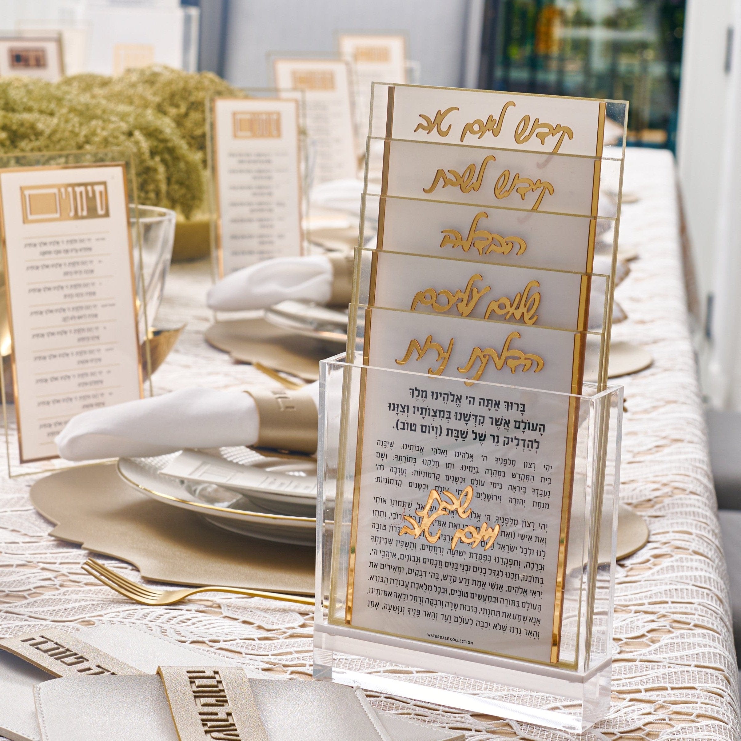Elevate your Shabbos table with the Classic 2.0 Shabbos Card Set, a beautiful and functional addition to your home. This elegant set includes five frosted lucite cards, each designed to enhance your Shabbos experience. The cards—Kiddush Yom Tov, Kiddush Shabbos, Havdalah, Shalom Aleichem, and Hadlokas Neiros—are showcased in a vertical arrangement, making them easily accessible throughout the day. Nestled in a clear lucite case, the cards can be pulled out and placed on the included base for easy use. Perfect for adding a touch of sophistication and organization to your Shabbos, the Classic 2.0 Shabbos Card Set is a must-have for any home.