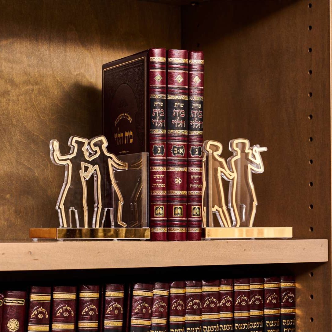Decorative home sculptures taken to the next level with this magnificent luxury thick lucite Chassidim Book End Sculpture. Crafted out of one inch thick crystal clear lucite, this Chassidim Book End sculpture features an almost hand-painted look with three-dimensional gold metallic embellishments. Freestanding design is perfect for display in the Living Room, dining room buffet, study, bookcase or office.