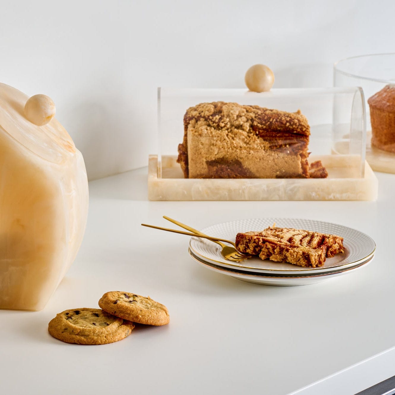 The rectangular base is crafted from hand-poured marbled resin, creating rich movement and depth in every piece. Because of the unique resin patterning, no two cake domes are exactly alike, making each one a one-of-a-kind serving accessory.
