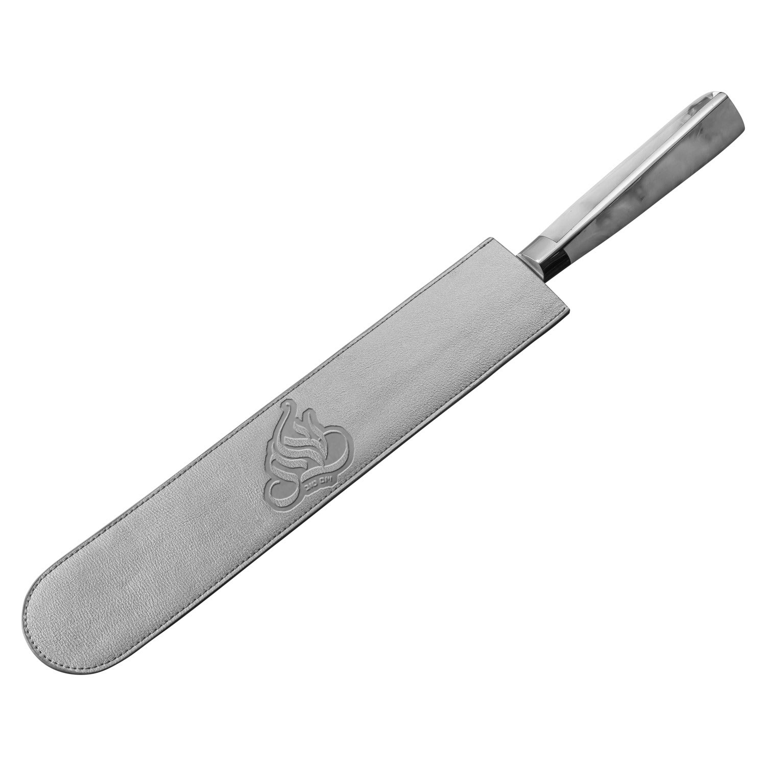 This sleek Leather Knife Blade Cover is designed to protect your sharp Challah knife. Beautiful with embossed words, and so practical for a family of children. Set your table without the worry of an exposed blade!