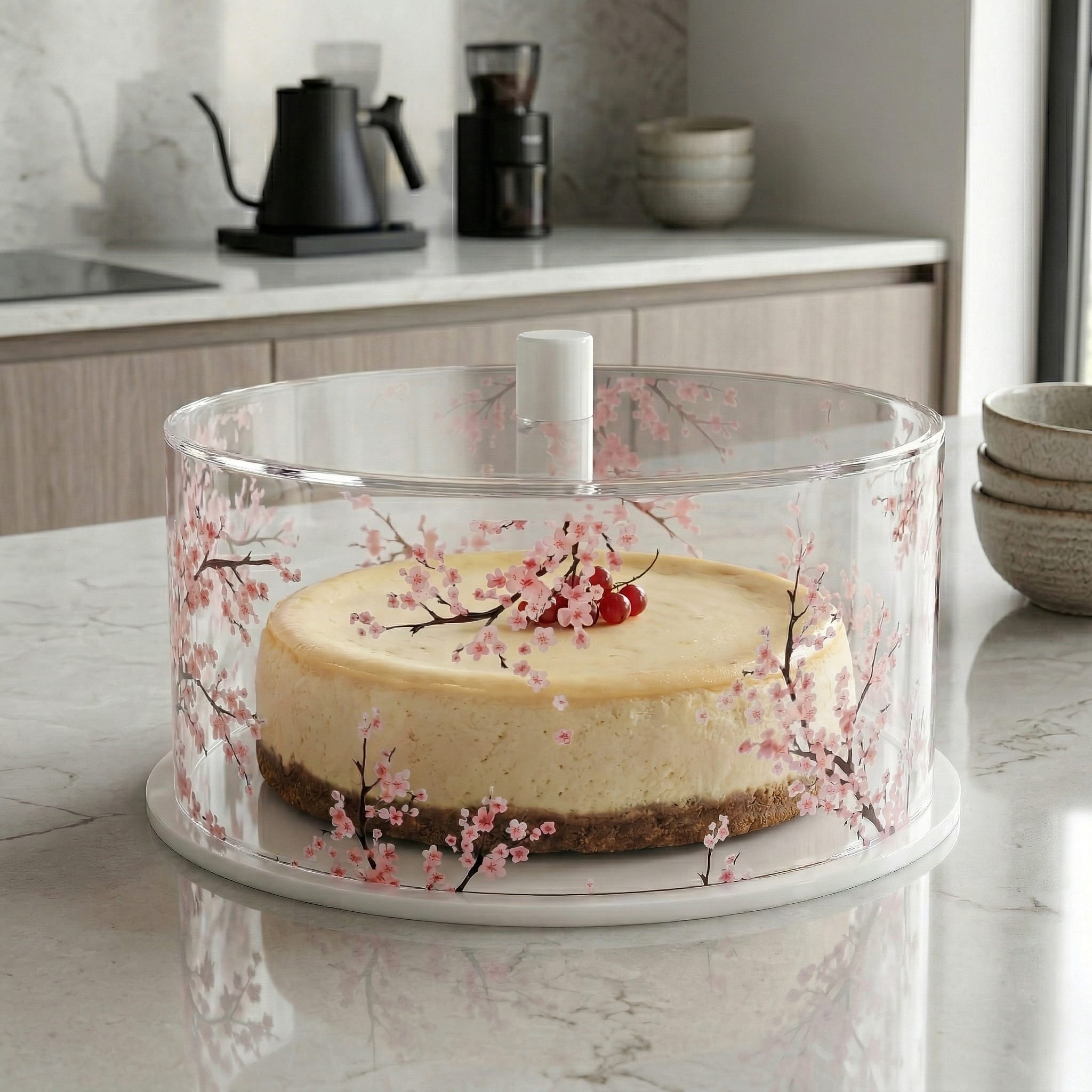 Display your desserts beautifully with this elegant Round Cherry Blossom Cake Dome. Featuring a delicate pink cherry blossom design set against a clear backdrop, this stunning cake cover brings a soft, romantic touch to any table setting.