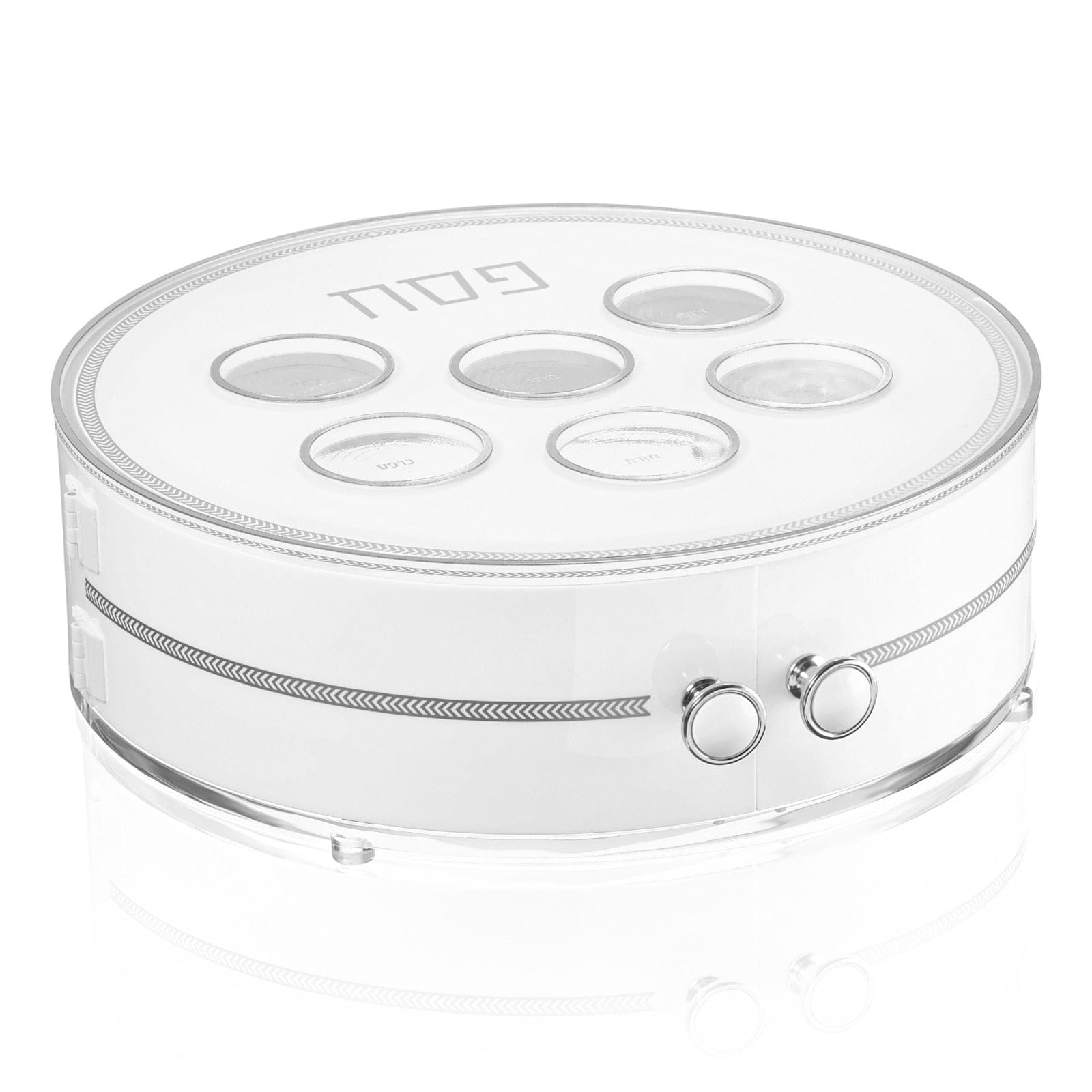 Thoughtfully designed for both elegance and function, it includes a dedicated compartment for the three matzos (מצות), protected by sleek doors that close securely with hidden magnets to keep everything neatly in place throughout the Seder. Perfect for hosting, gifting, and year-after-year use, the Herringbone 3 Level Seder Plate highlights the beauty and significance of Yetziyas Mitzrayim with understated luxury.