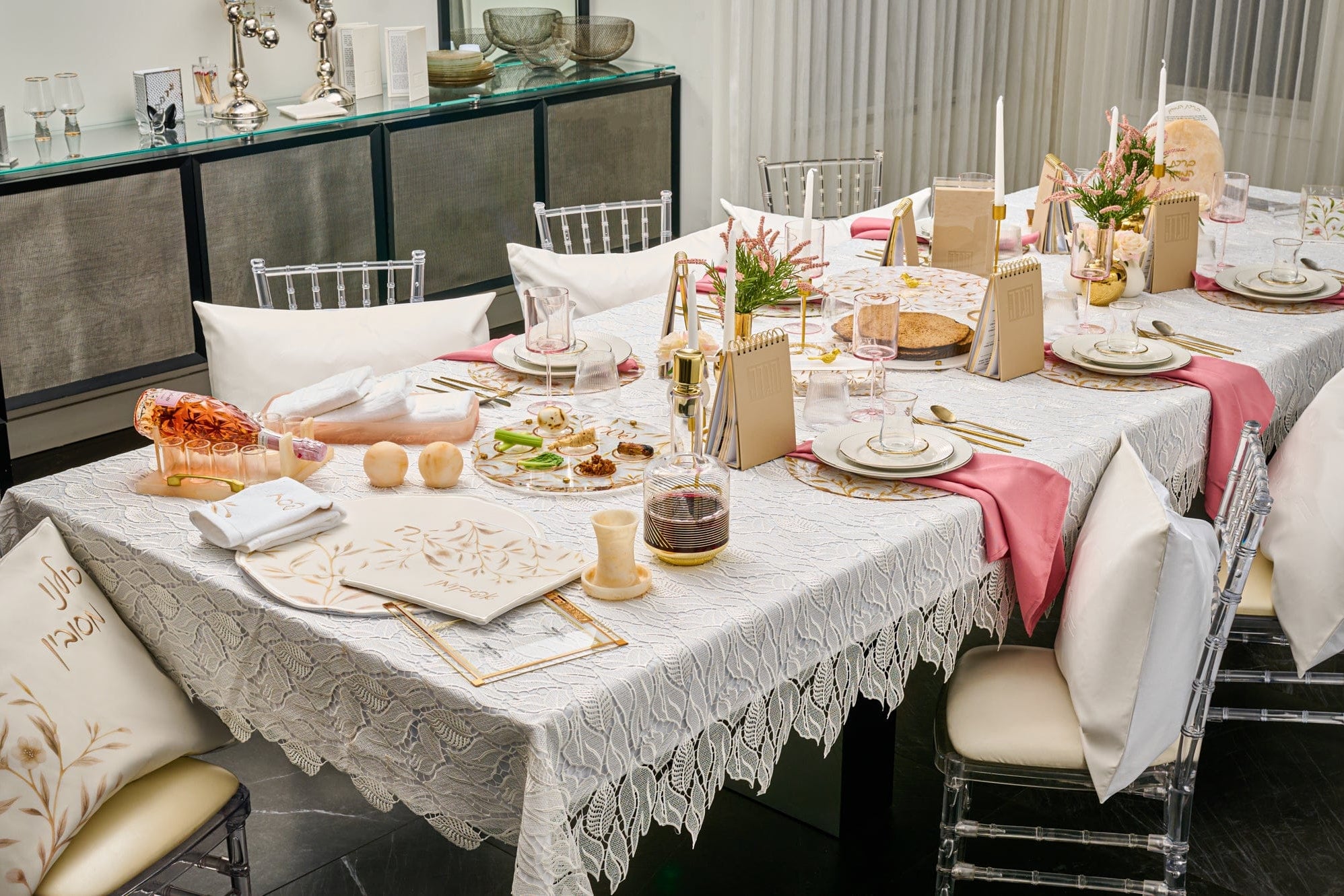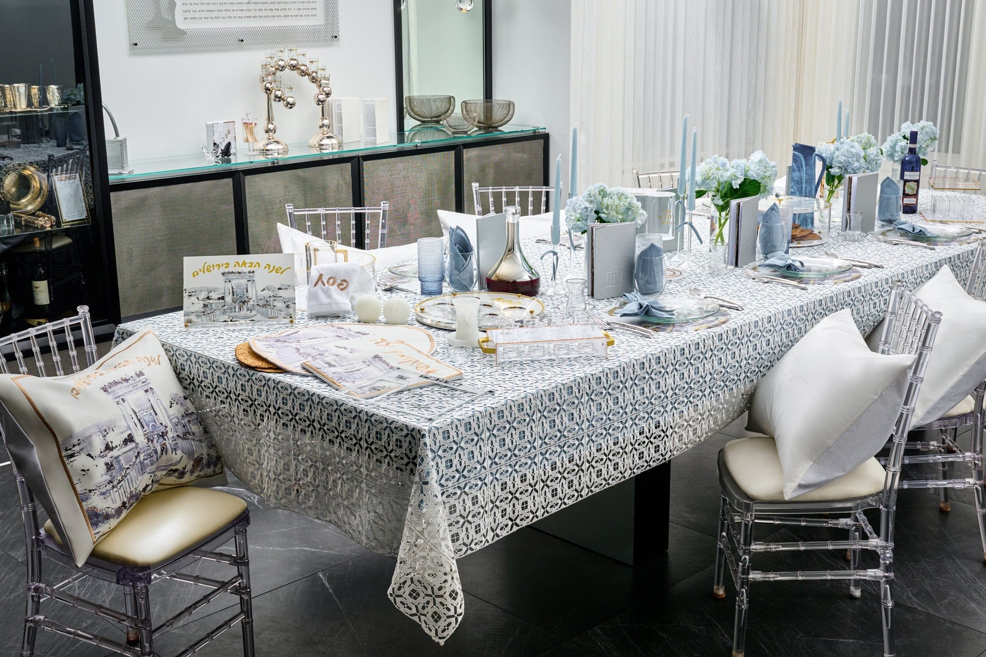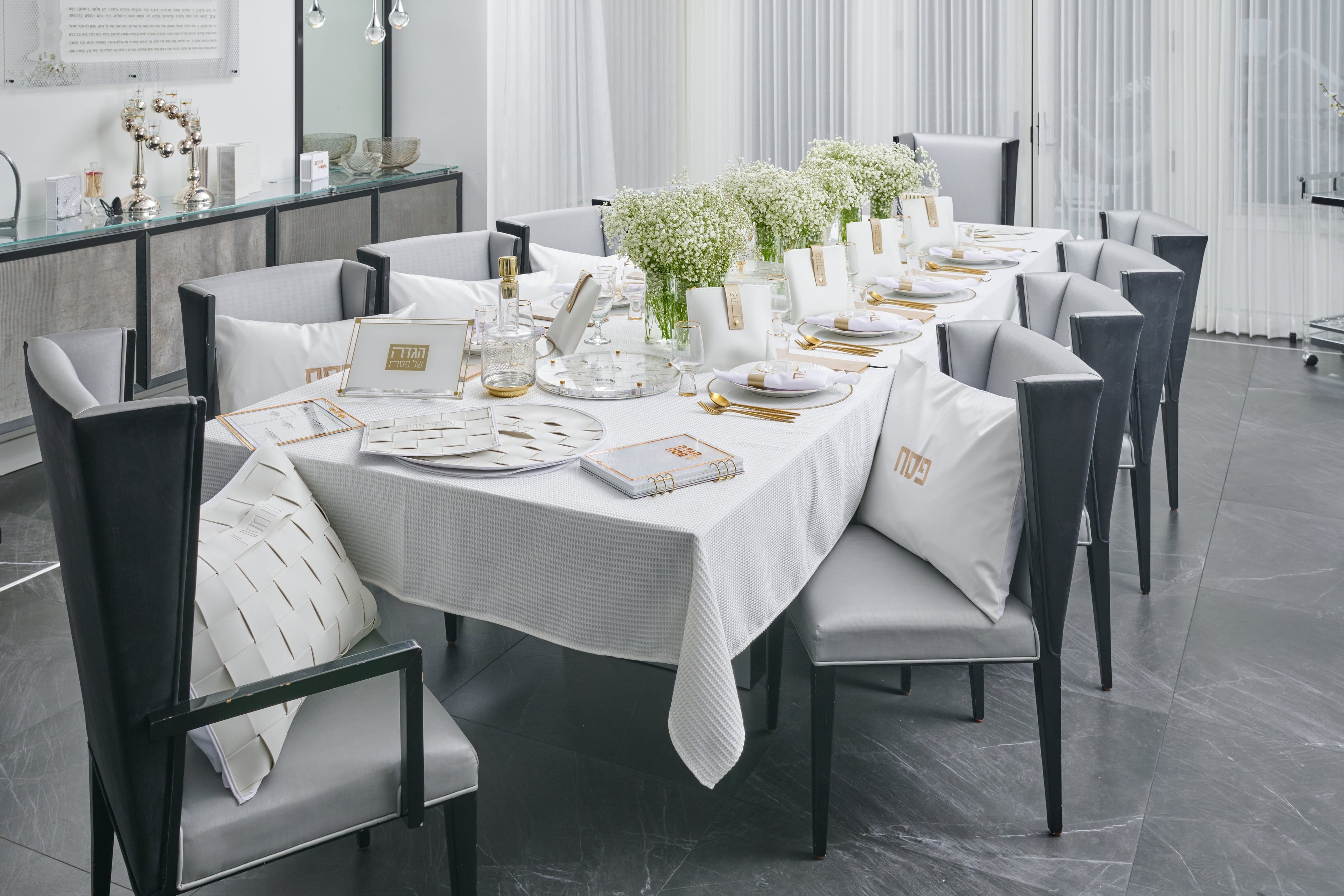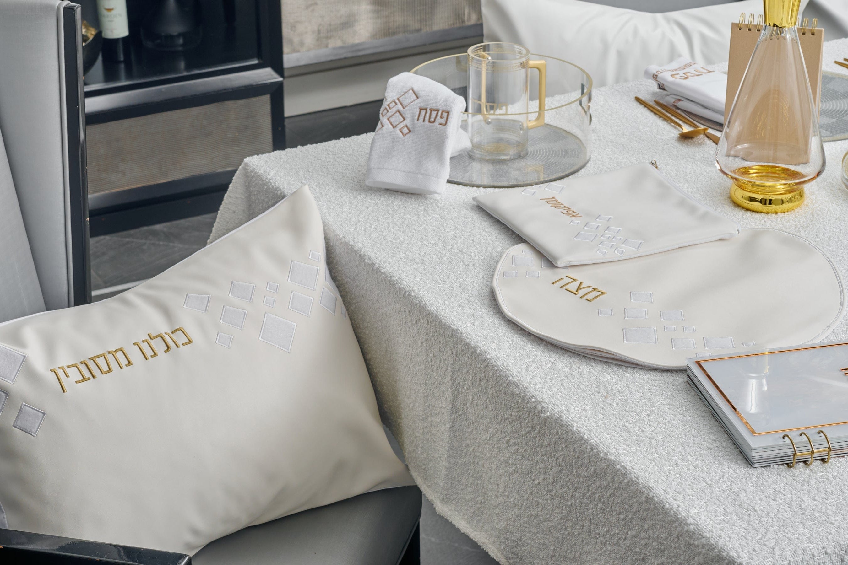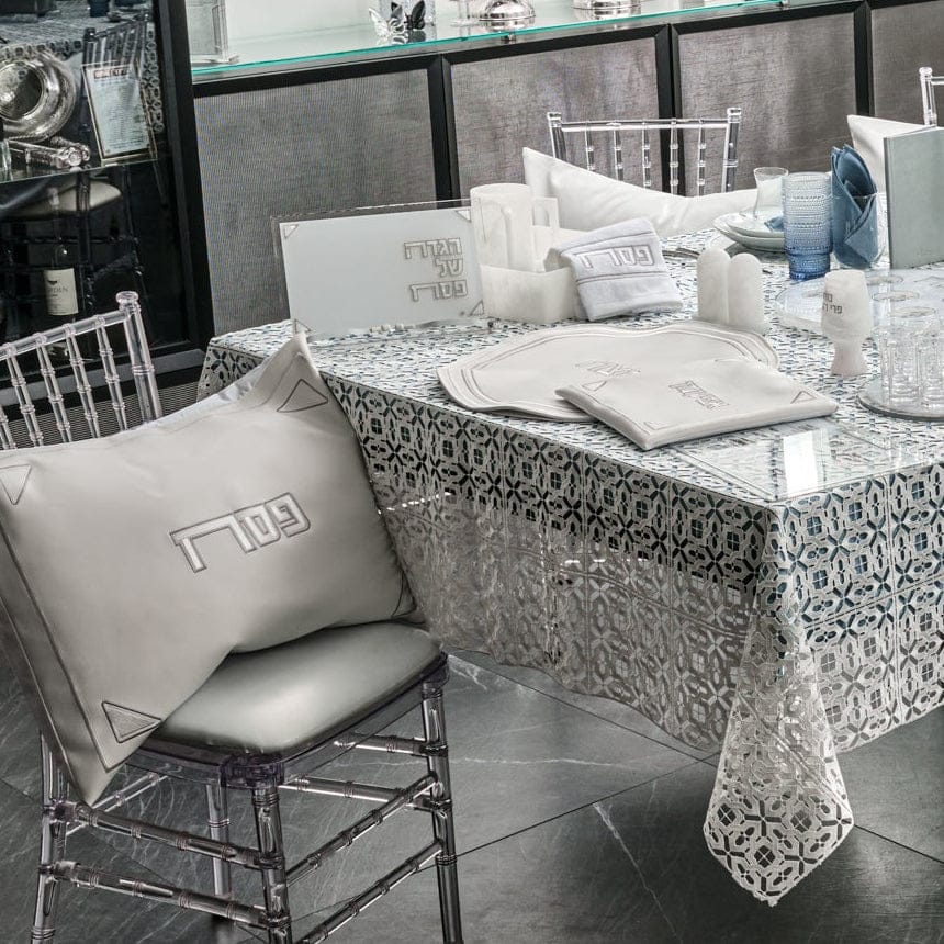 A Pesach Seder table includes the essential ritual items used during the Passover Seder, along with coordinated Judaica that creates a clean and meaningful table setting.