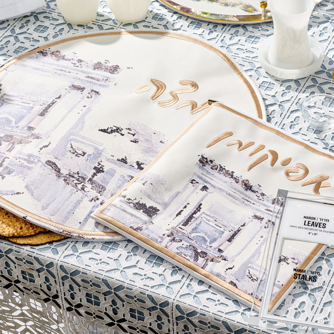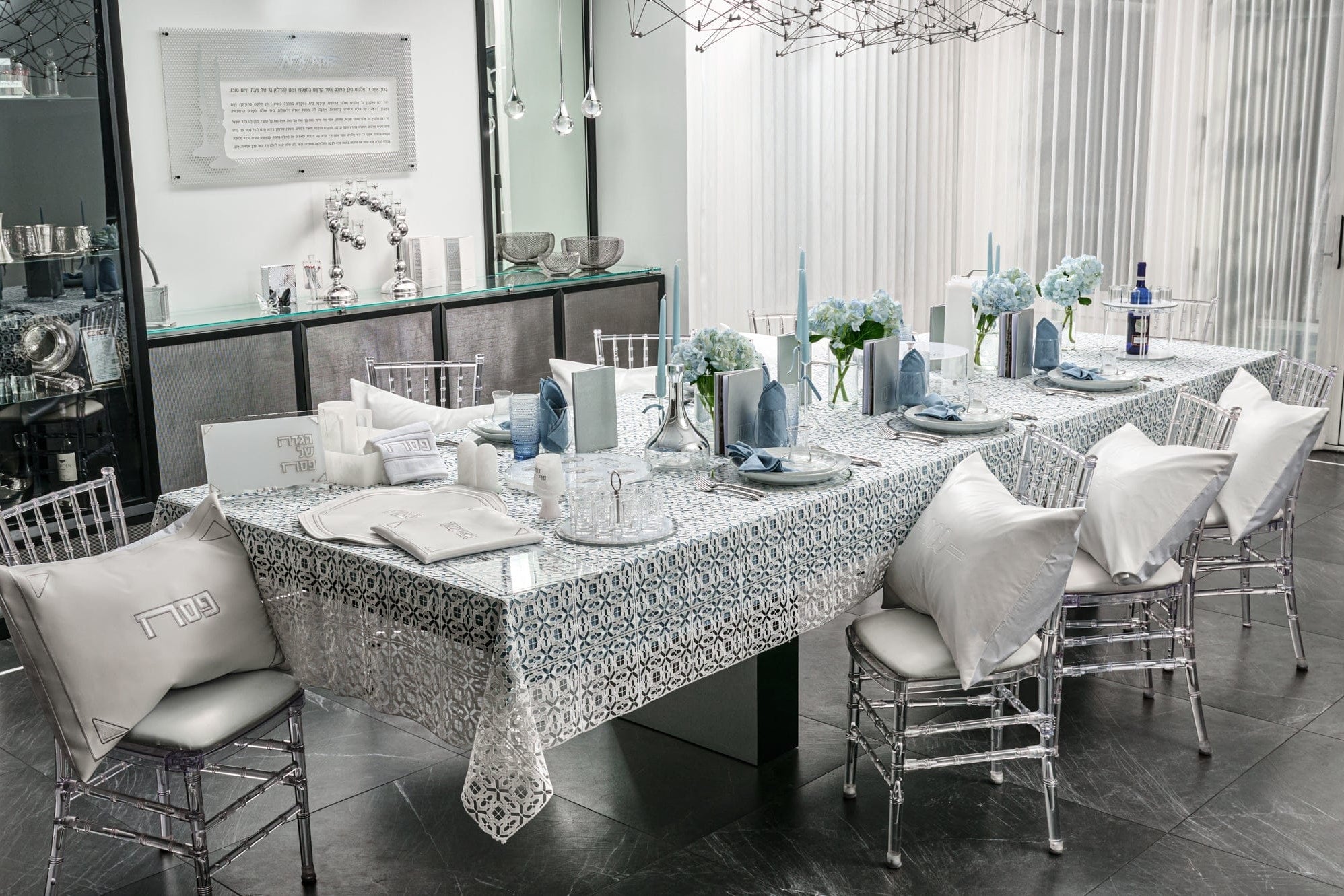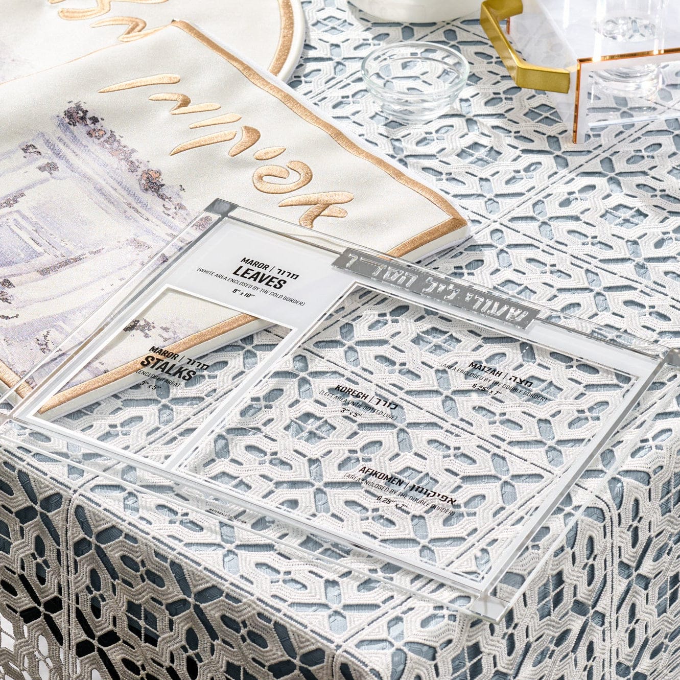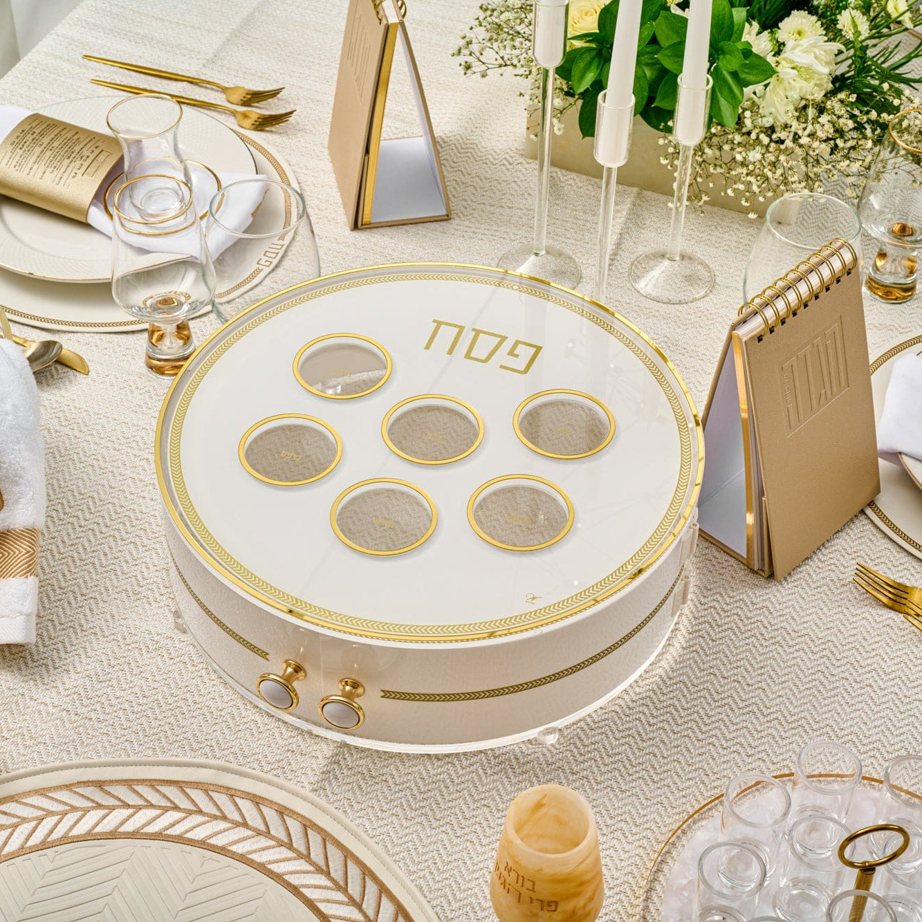 A Pesach Seder table includes the essential ritual items used during the Passover Seder, along with coordinated Judaica that creates a clean and meaningful table setting.