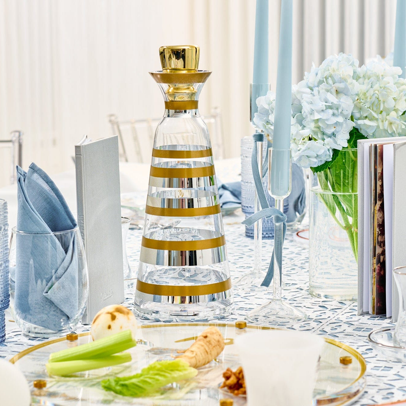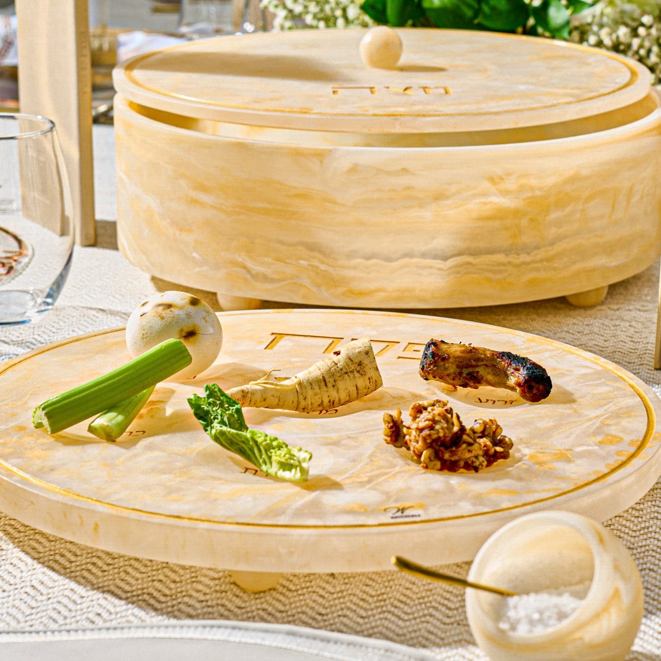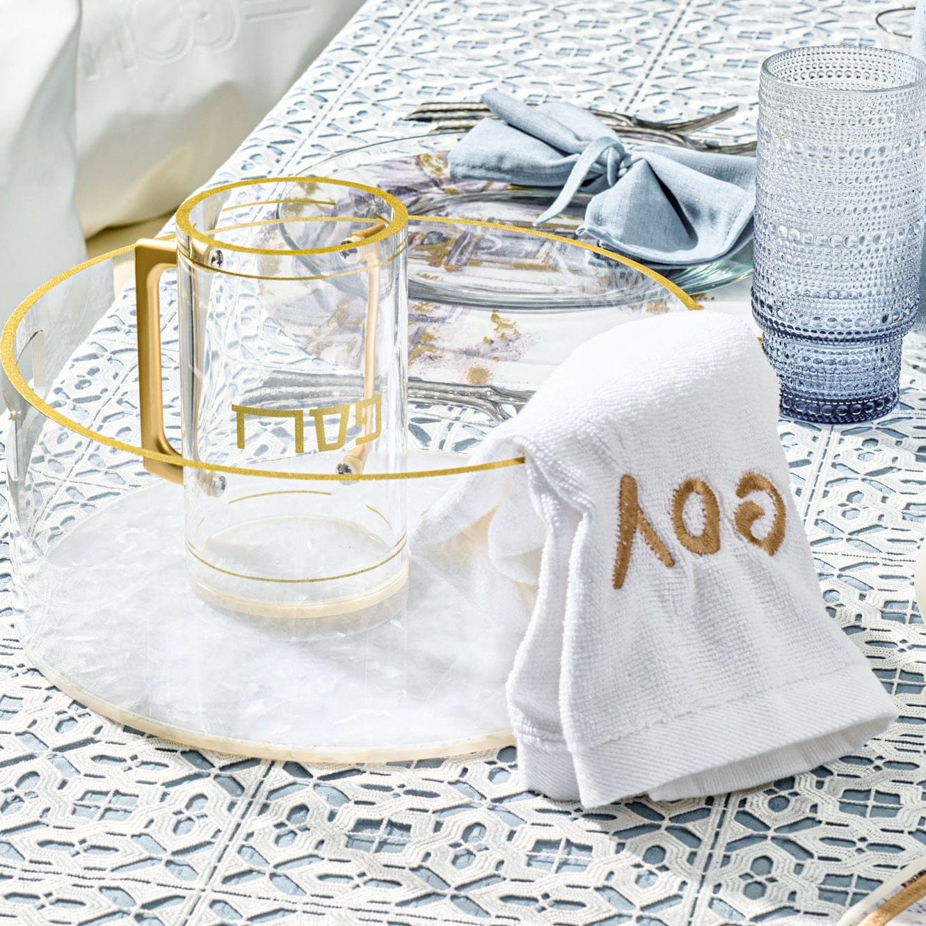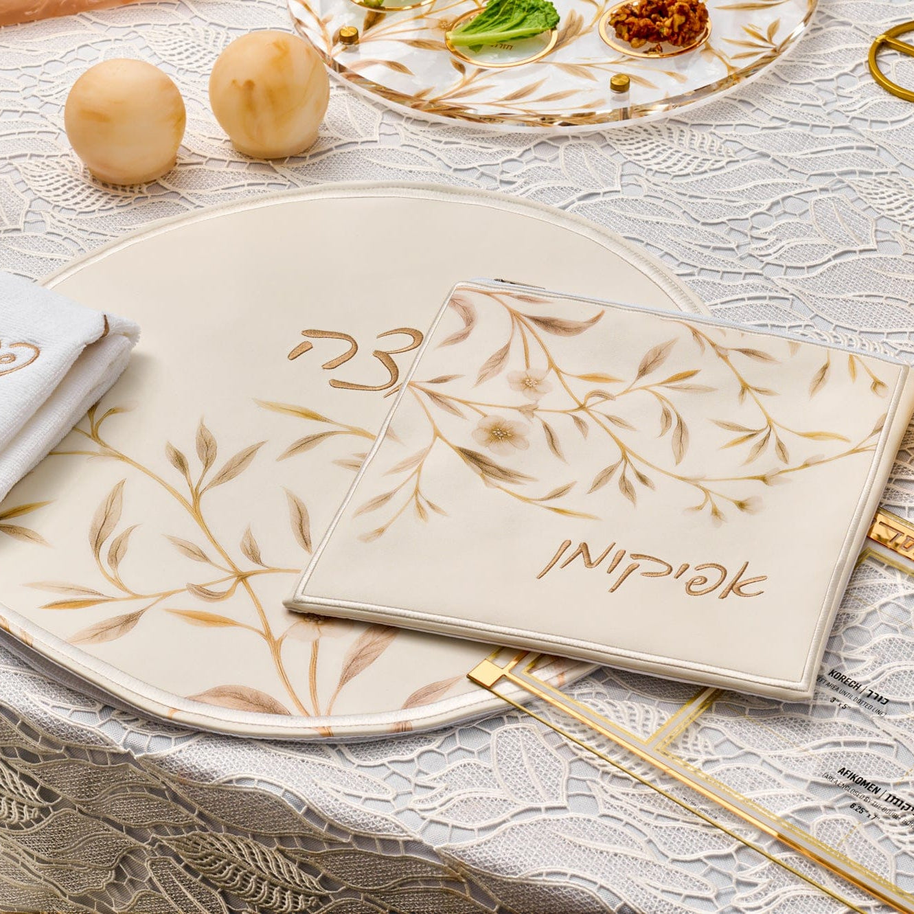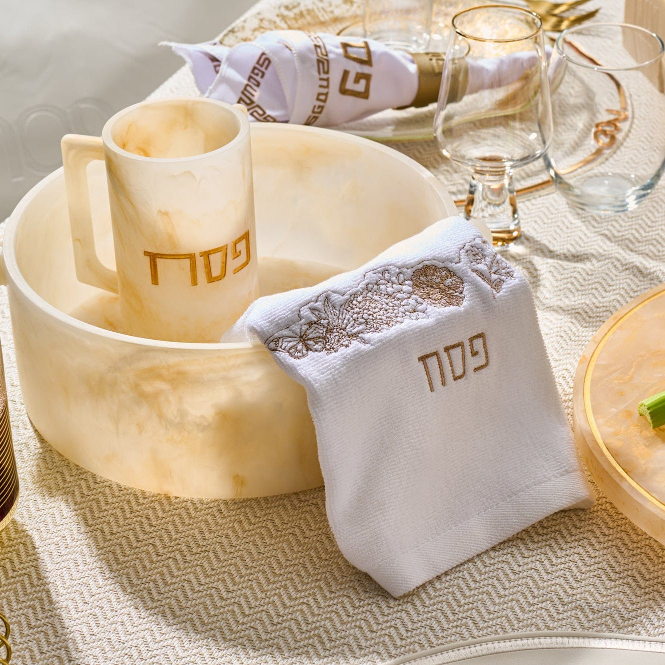 A Pesach Seder table includes the essential ritual items used during the Passover Seder, along with coordinated Judaica that creates a clean and meaningful table setting.
