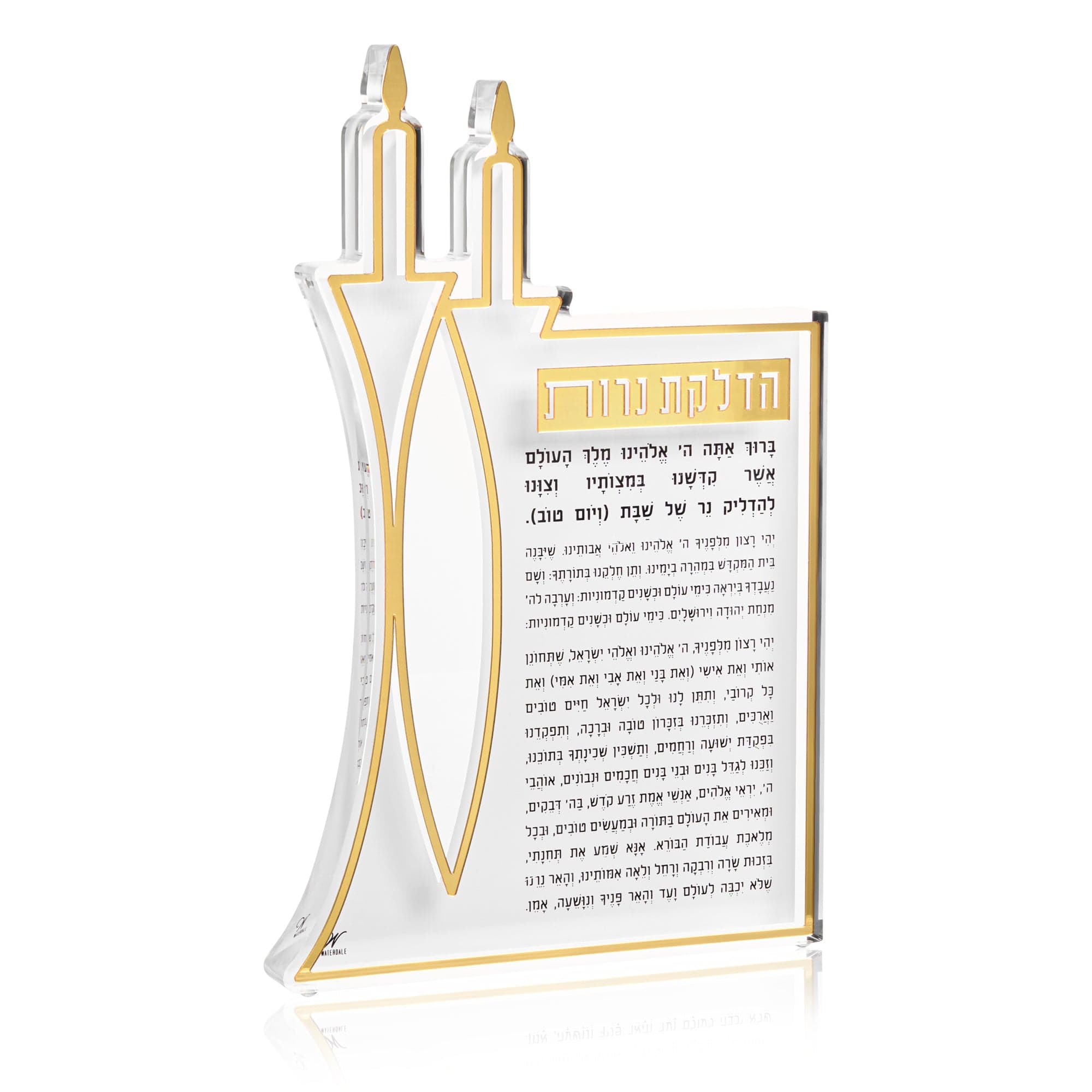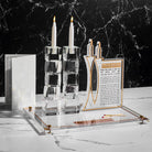 Decorative home sculpture meets luxury Judaica in this striking Hadlokas Neiros Sculpture, crafted from ultra-thick, one-inch crystal-clear lucite. Designed in the signature Classic 2.0 style, this freestanding piece features the bracha for הדלקת נרות שבת.