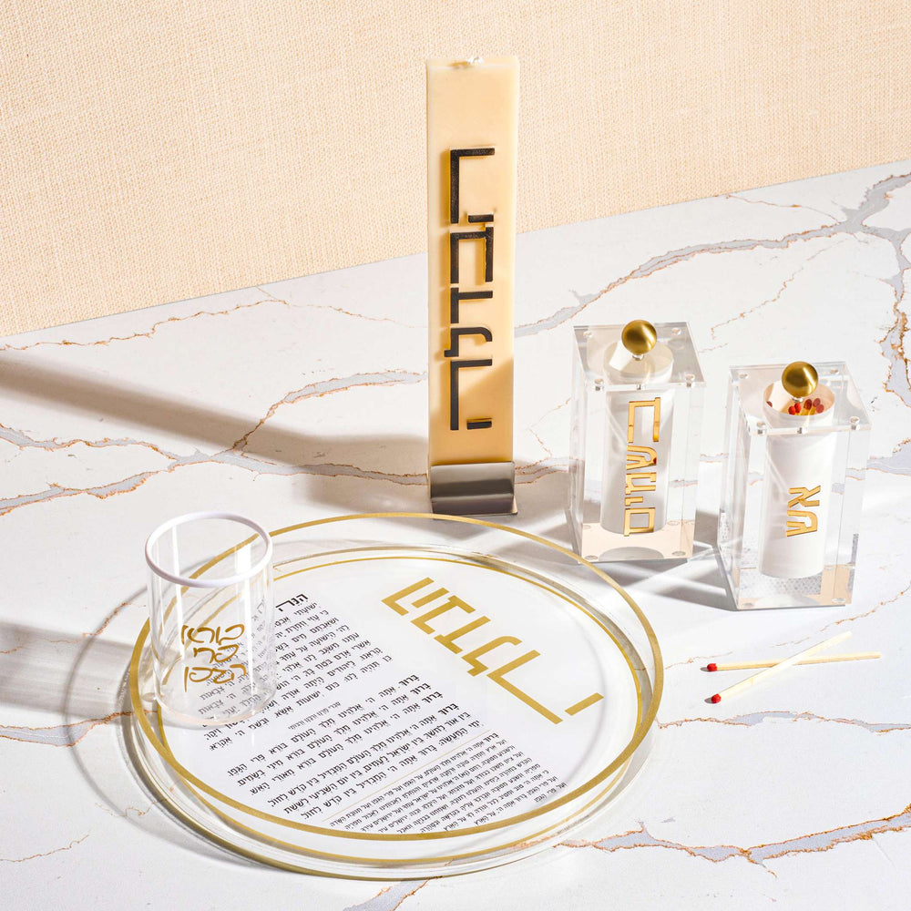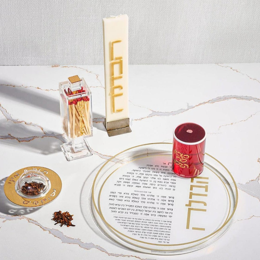 is a gorgeous must-have for your Motzei Shabbos. Enhance your Havdalah with this set including a square match holder, minimalist Havdalah candle, classic 2.0 Havdalah plate, die-cut Besamim jar and minimalist wine decanter.