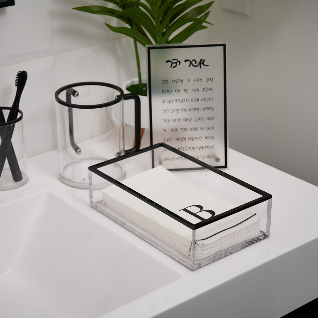 • Netilas Yadayim Gift Box Waterdale Collection gift set with embroidered Netilat Yadayim hand towels, Asher Yatzar acrylic plaque.