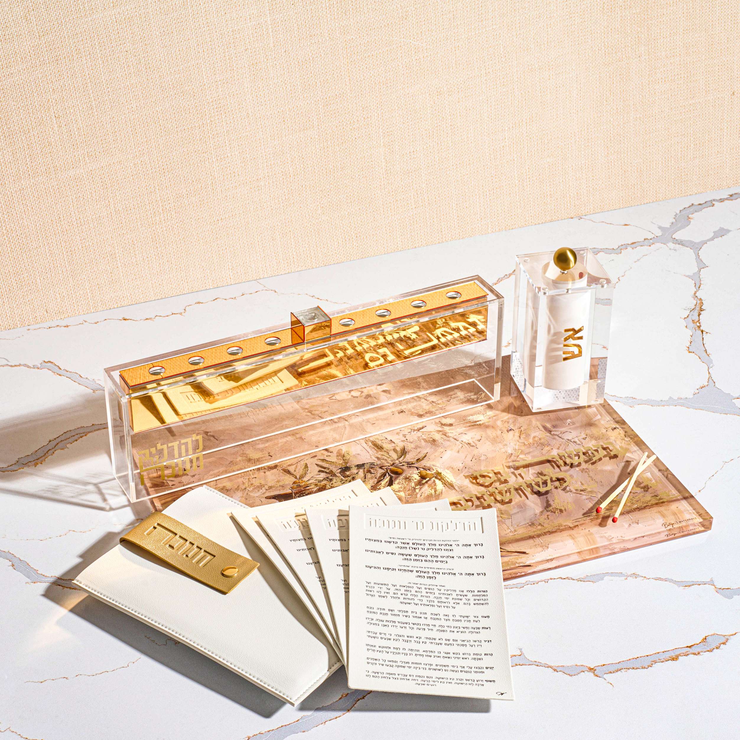 This gorgeous luxe Raised Painted Batya Menorah Tray is a gorgeous must-have by your Chanukah candle lighting! Features magnificent painted lucite, standing pegs, and the full Chanukah Brachos.